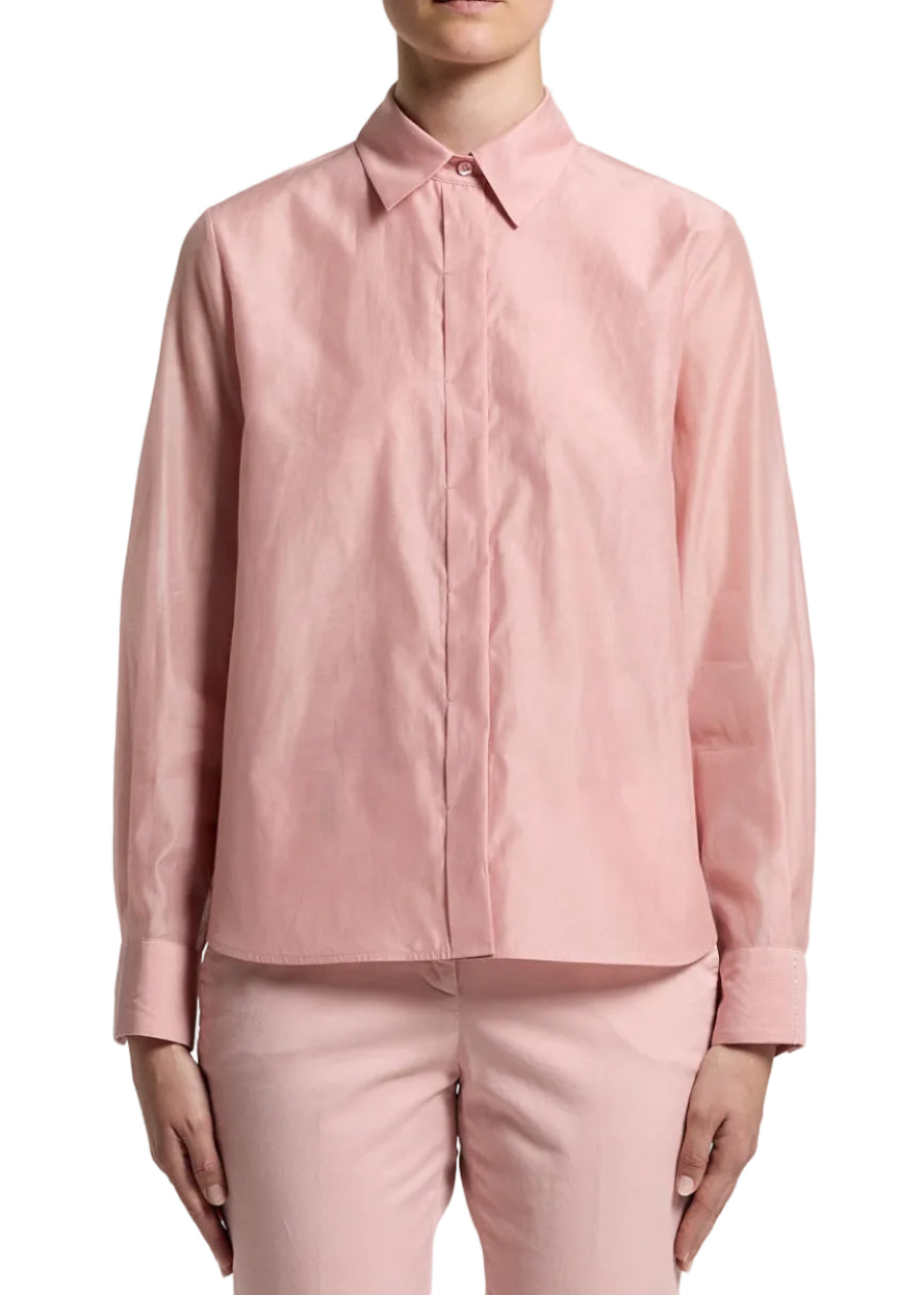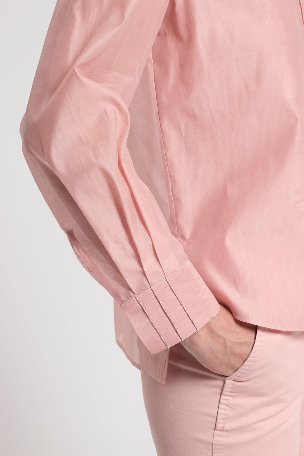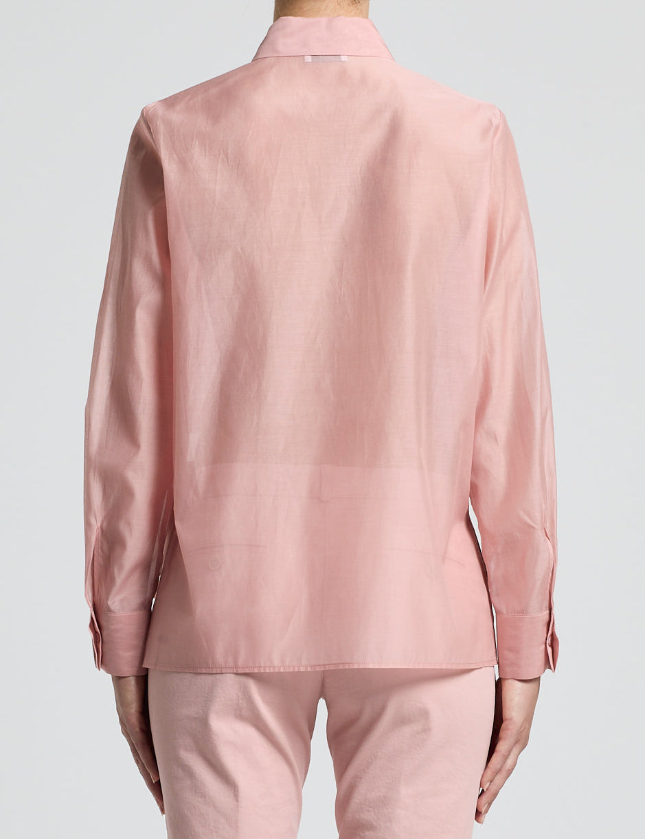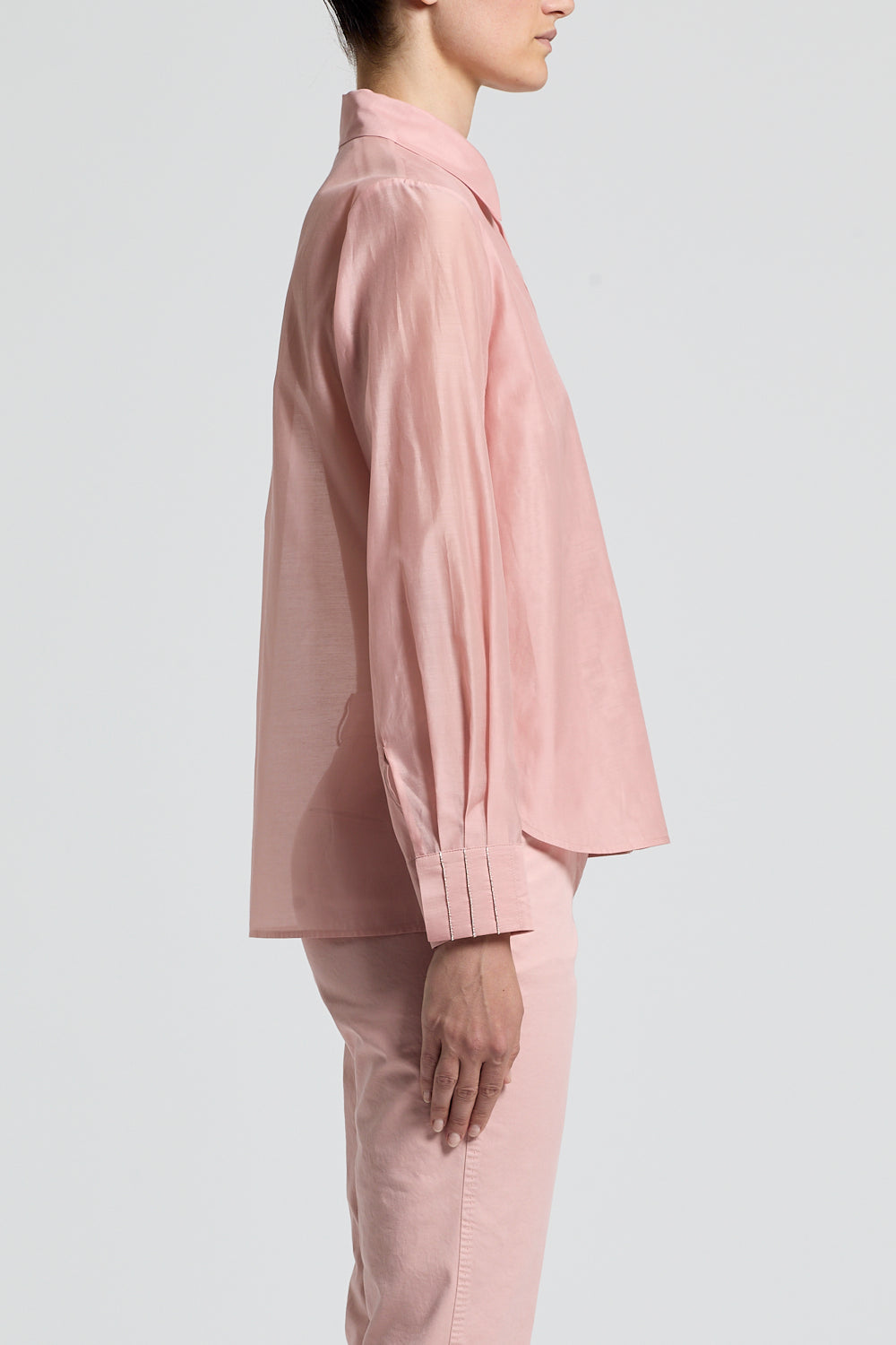 This spread-collar shirt is made from matte silk and cotton organza, a fabric that enhances shape and volume through lightness and structure. The long balloon sleeves create a play on volume that interacts with the full line of the body. The cuffs are embellished with small heat-sealed opalescent rhinestones. In this shirt, the organza is transformed into a language of shapes, movement and bright details.