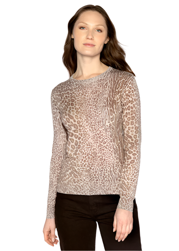 Elevate your wardrobe with the Leopard Print Crew in Taupe Multi, crafted from a luxurious blend of silk and cashmere. This sophisticated piece offers exceptional softness and warmth, while the subtle taupe and multi-toned leopard pattern adds a refined touch of wild elegance. Perfect for layering or wearing on its own, it combines comfort with timeless style for a polished, effortless look.