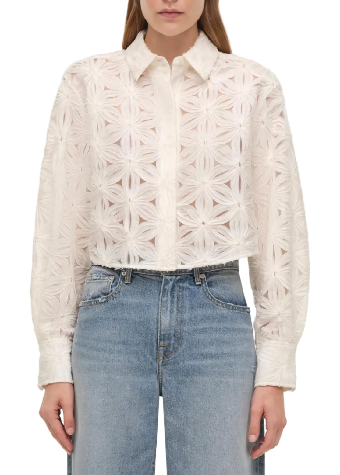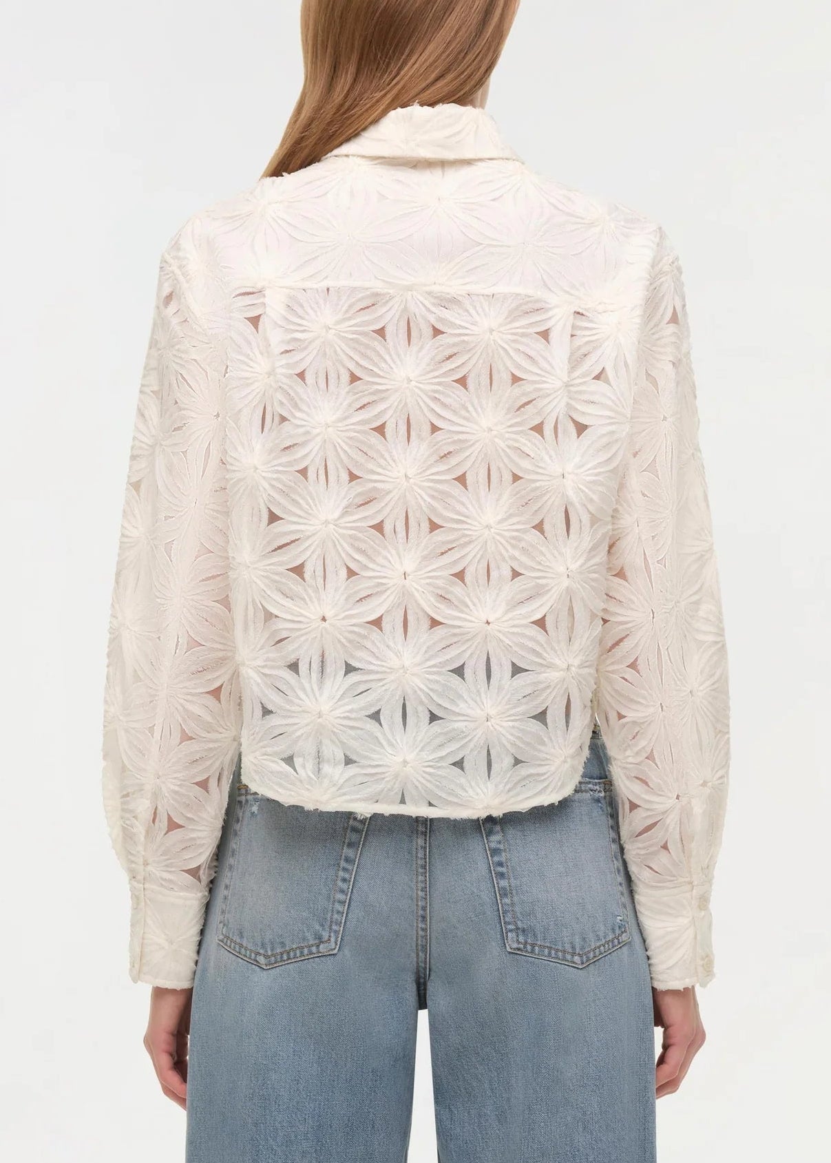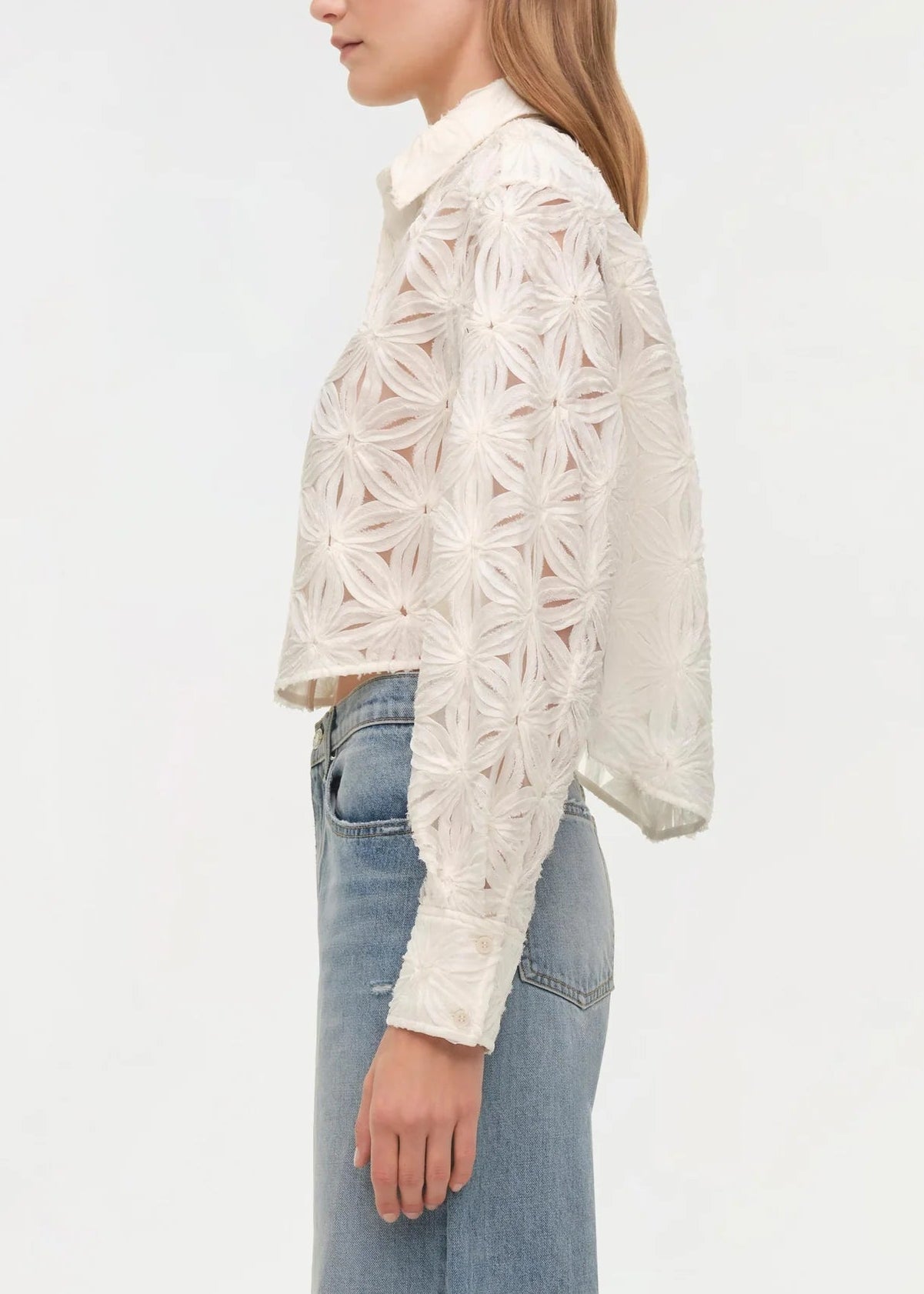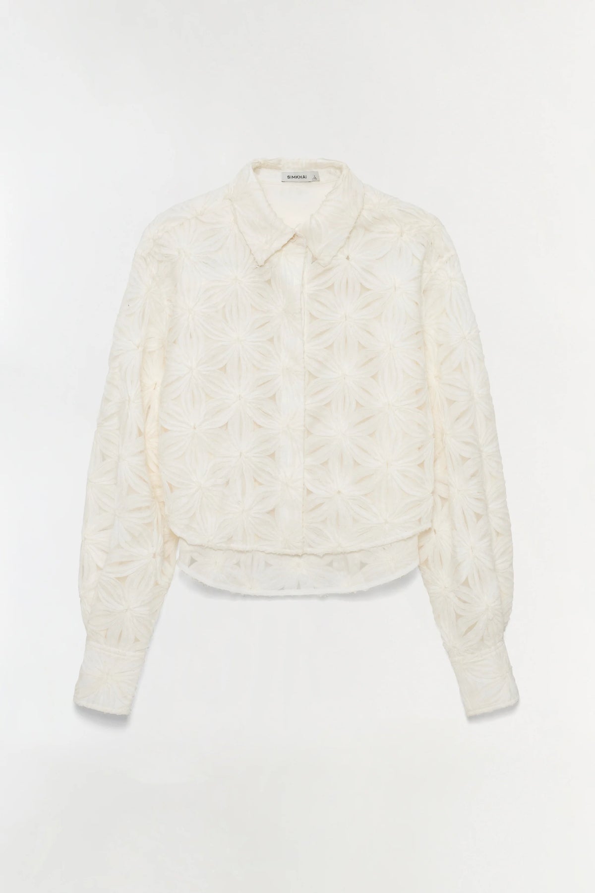 Delicately detailed with allover floral embroidery, this cropped shirt brings texture and dimension to a timeless silhouette. Designed with a pointed collar and concealed front placket, it’s cut for a softly structured fit with subtle volume through the sleeves. The intricate patterning adds depth while maintaining a refined, effortless feel.