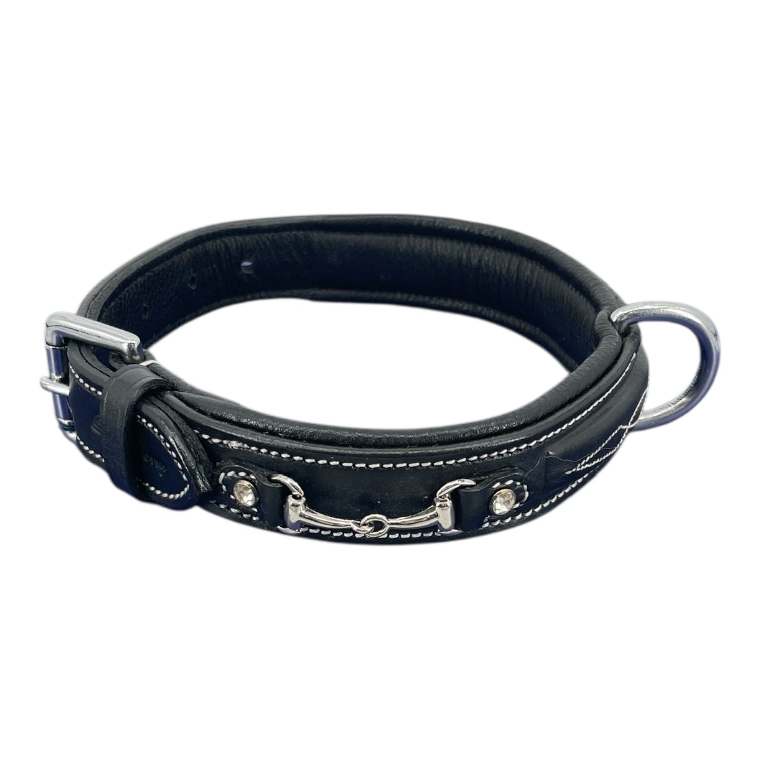 These beautifully handmade padded full grain leather dog collars with padded raised design and coordinating horse bits are available in brown with brass accents gold colored bits or black with silver accents, silver bits with crystal studs. Beauty, durability and great craftsmanship, these are a must buy for the equine dog lover!