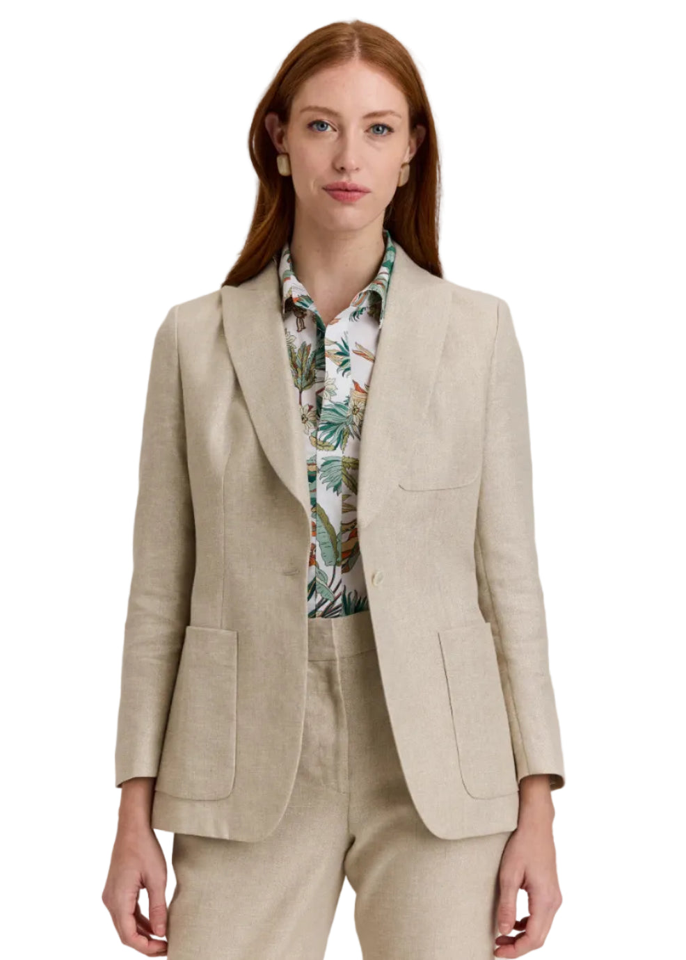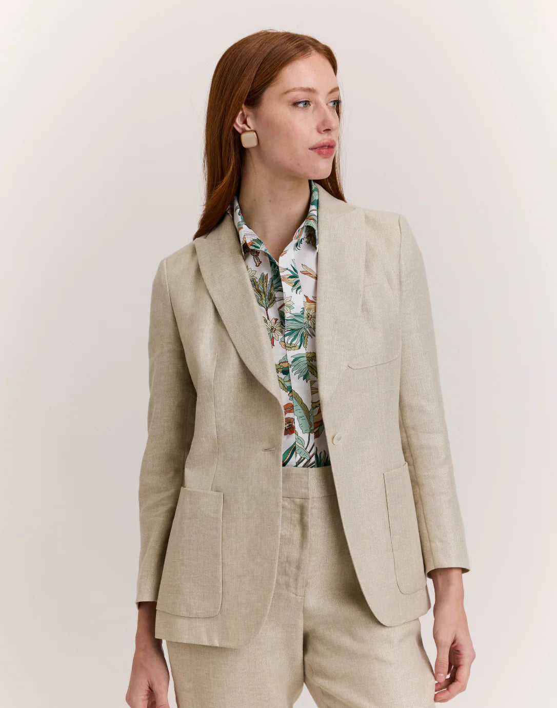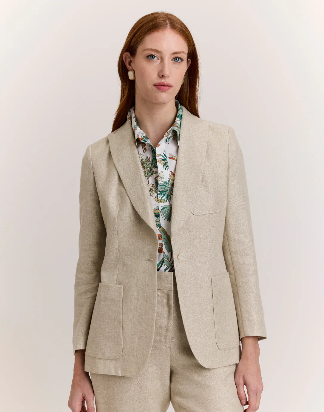 This linen blend is woven with subtle Lurex threads for a soft, refined shimmer that catches the light beautifully. Breathable linen provides a crisp, natural texture, while viscose adds fluidity and comfort for ease of movement. The result is a lightweight fabric that feels fresh and polished, offering a touch of shine without sacrificing wearability.