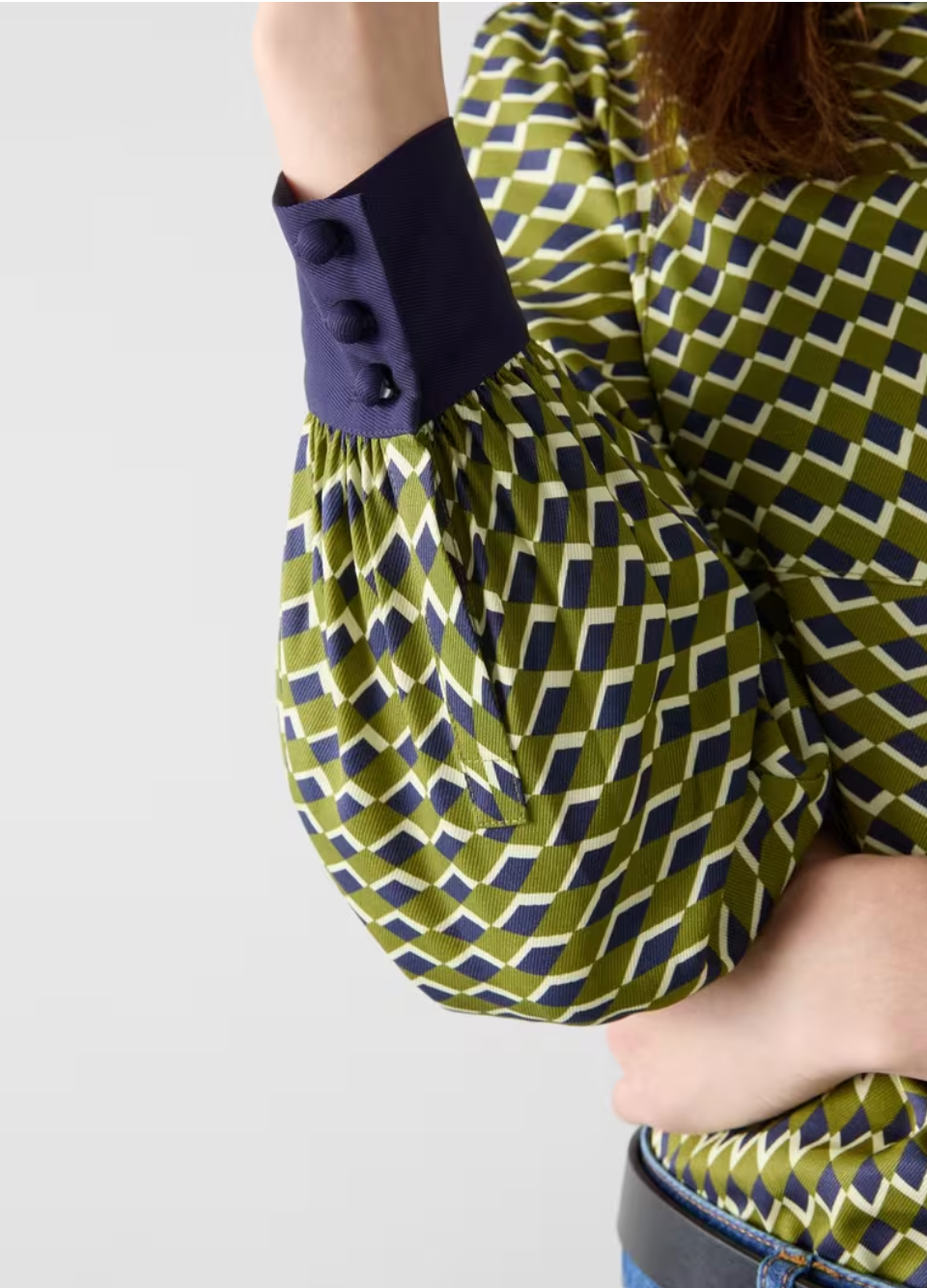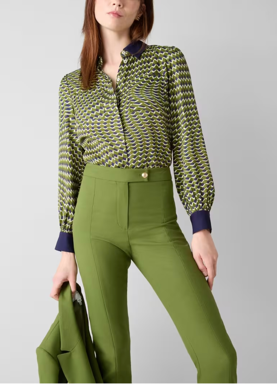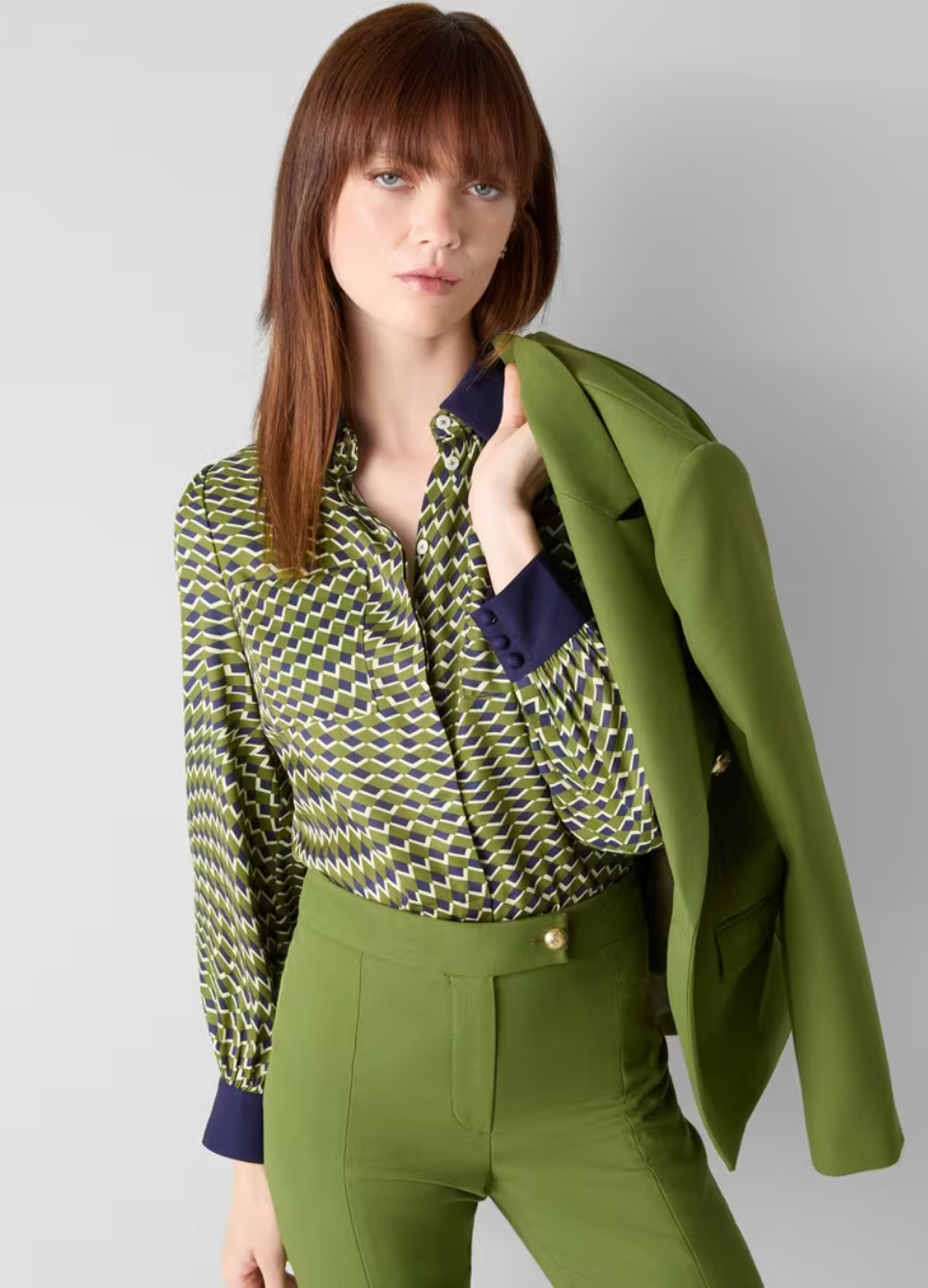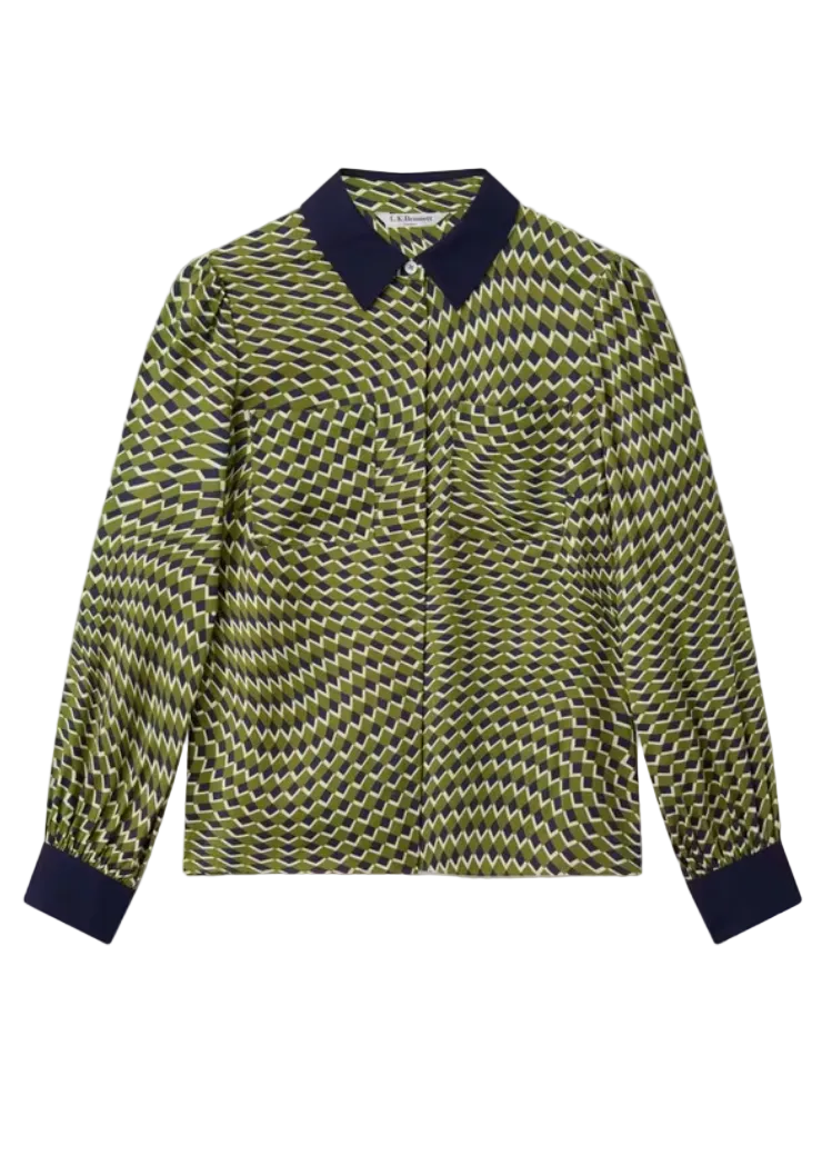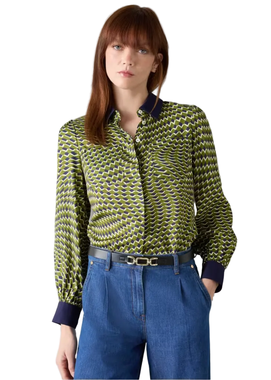 The Henri shirt features a vibrant peridot and navy multi-coloured abstract print. Made from FSC-certified fabric. This long-sleeved button-through woman's top showcases our in-house swirl chequerboard pattern with graphic contrast design. The classic collared silhouette complements various outfits. Pair with high-waisted trousers for a polished office look, or layer over a tee with jeans for casual weekends. This distinctive top suits both day and evening wear as a wardrobe essential.