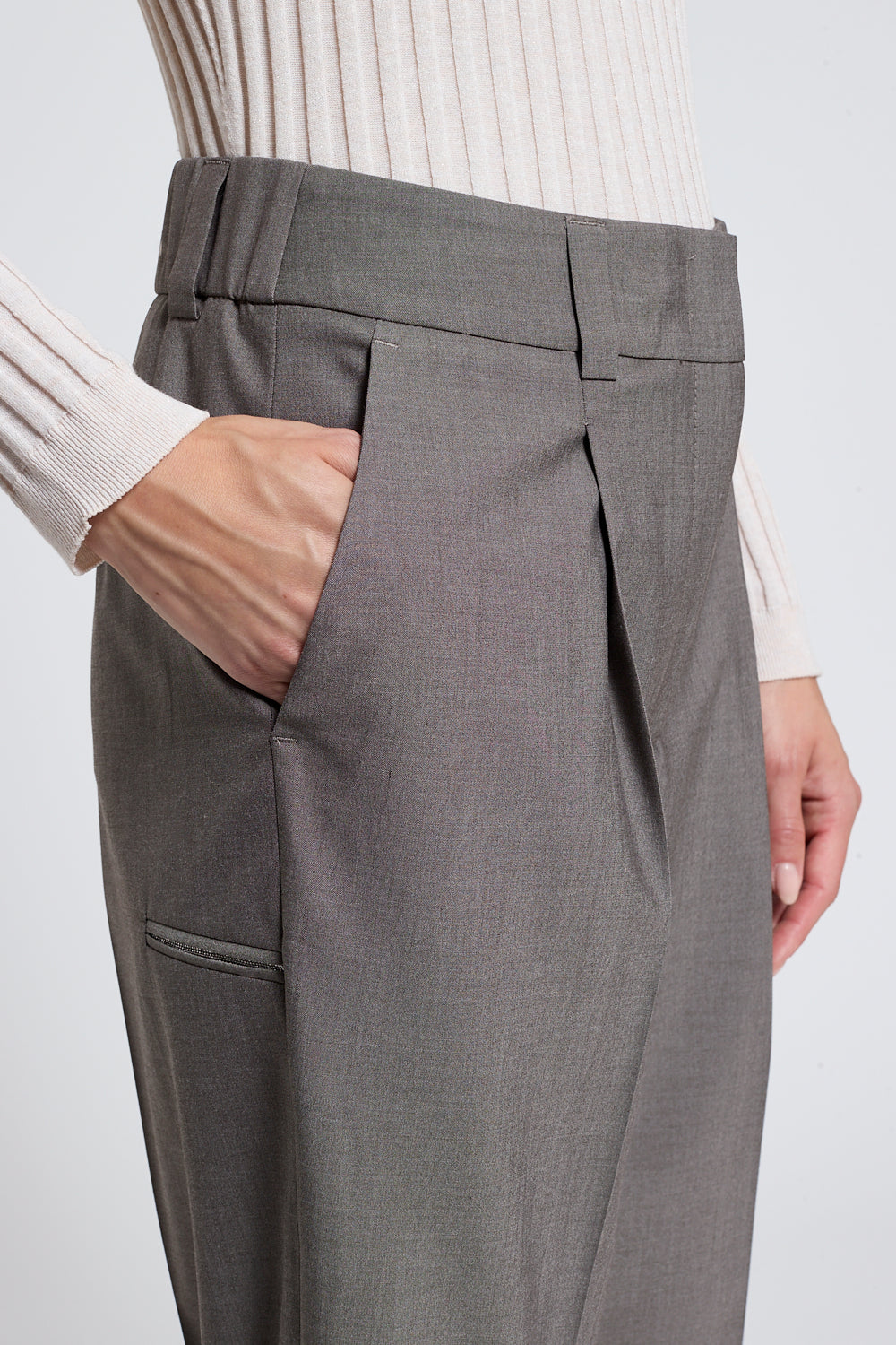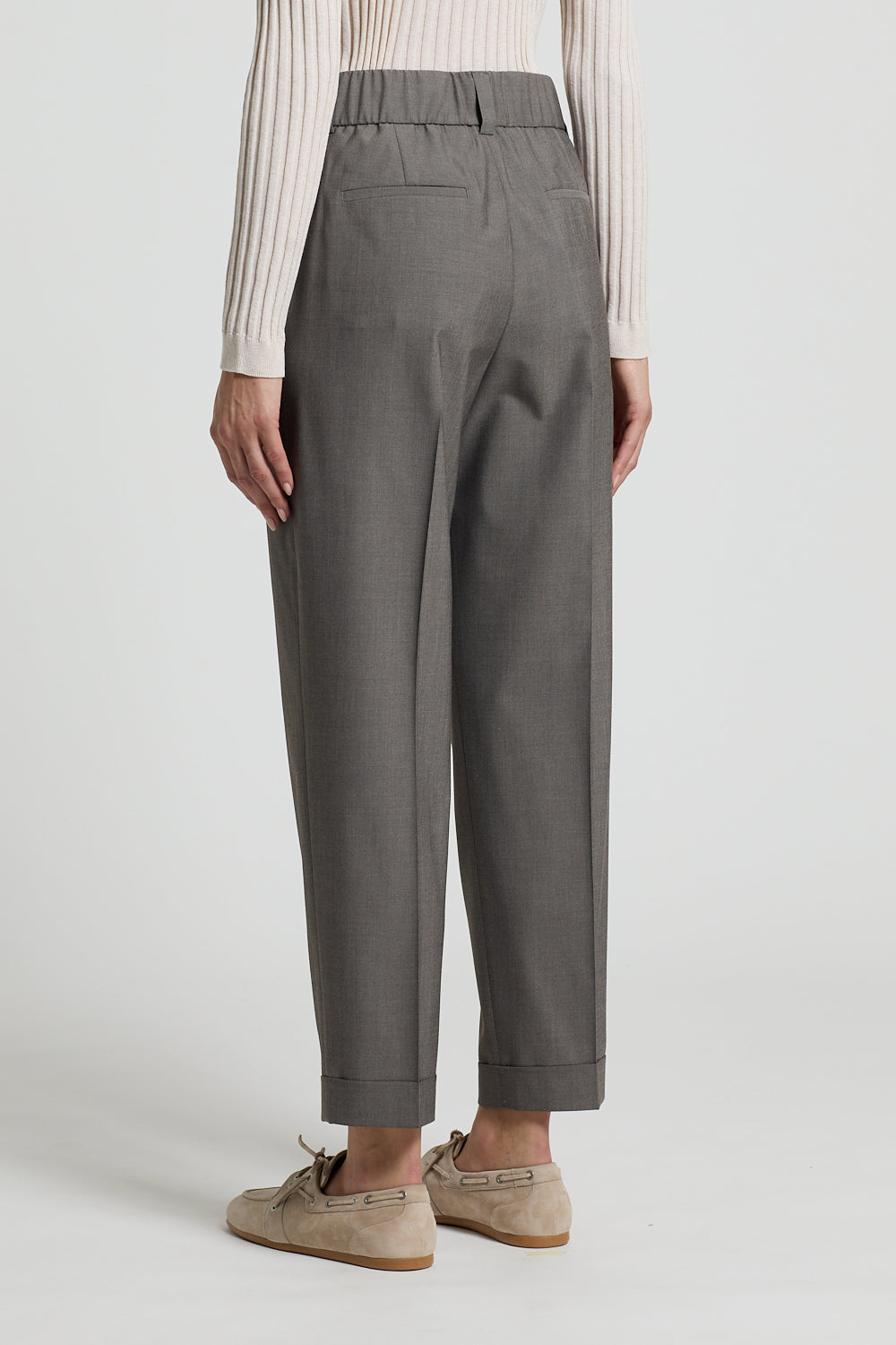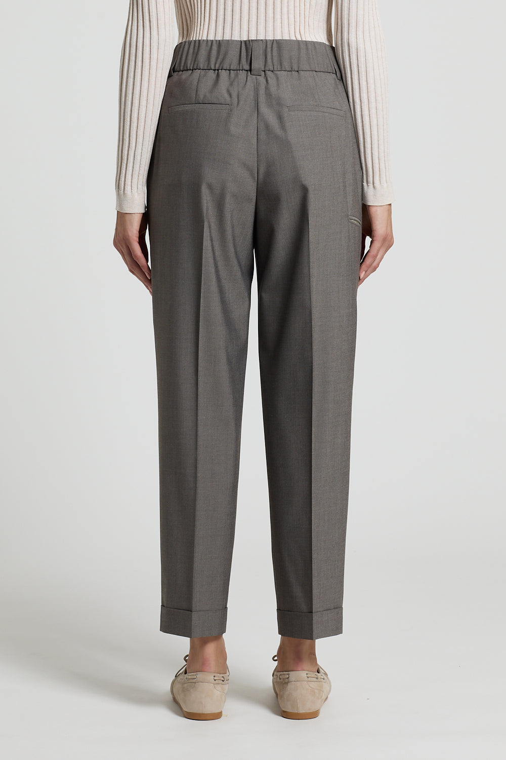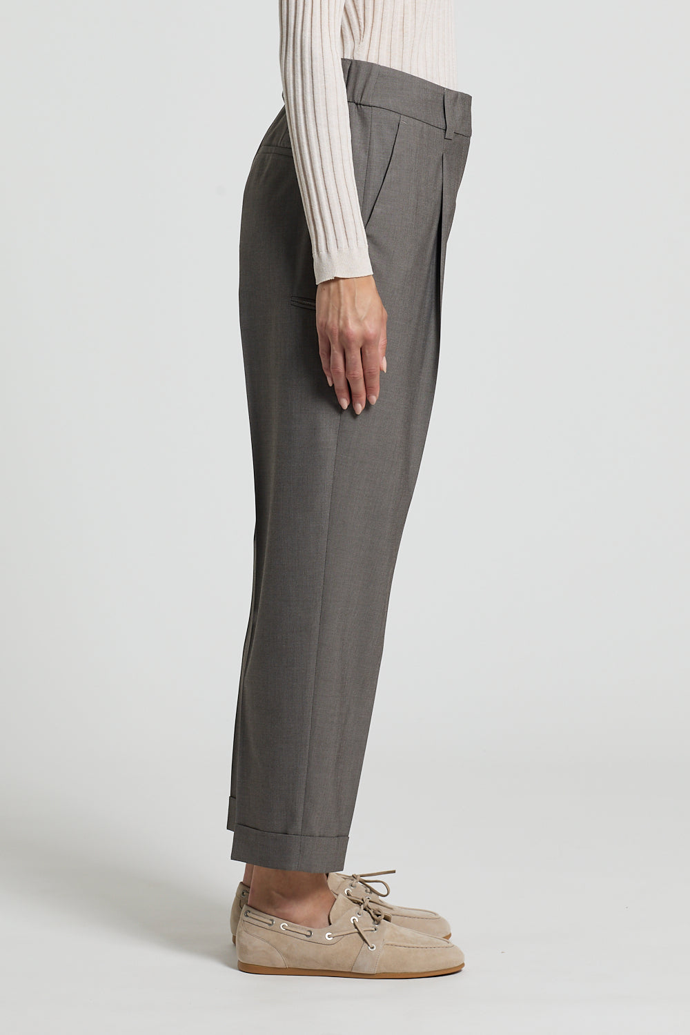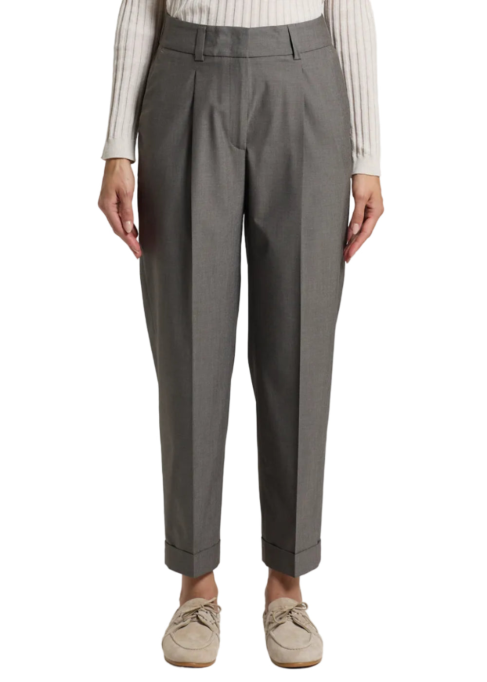 Elevate your wardrobe with these refined grey pleated cuff trousers. The structured pleats at the waist create a polished silhouette, while the cuffed hem adds a touch of timeless elegance. Crafted for the discerning dresser, these trousers transition seamlessly from office to evening occasions. The neutral grey tone pairs effortlessly with any blazer or shirt, making them an essential foundation piece for a versatile, sophisticated wardrobe.