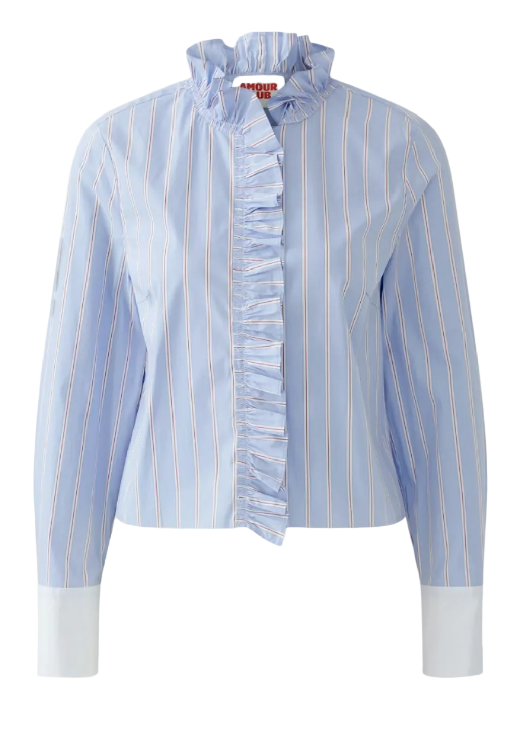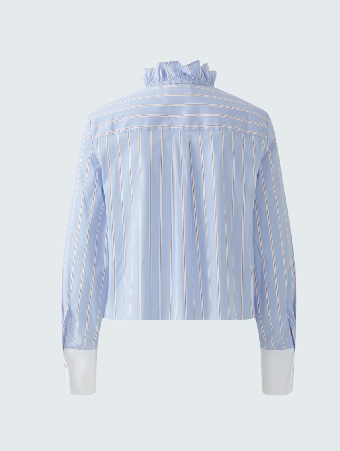Blouse with feminine ruffle in contrast to the highly modern shape