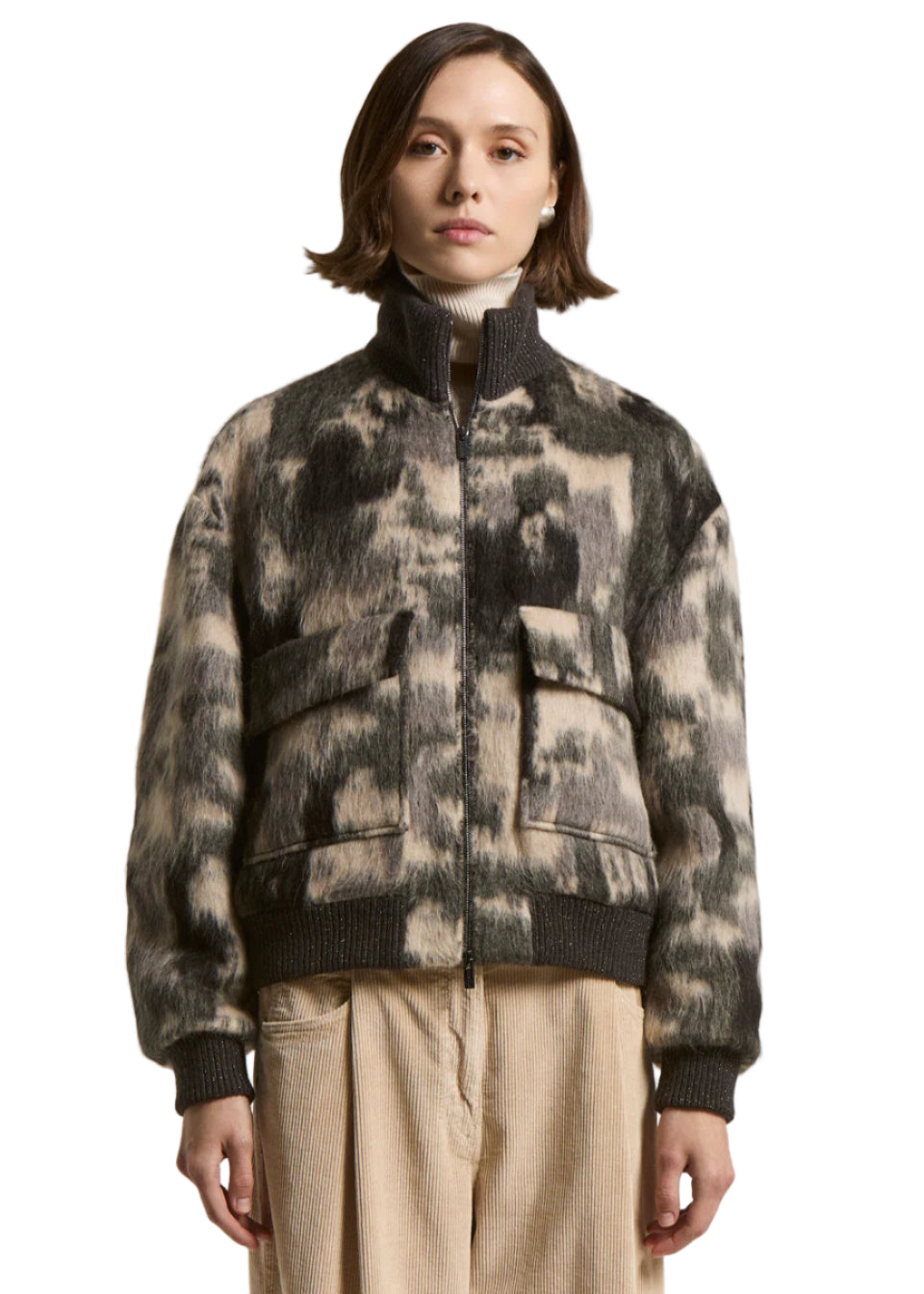 This bomber jacket with a high tricot collar is the more casual version of the iconic garment in the "Ricordo Futuro" collection, made from alpaca and wool jacquard with a camouflage design and a directionally set nap. This motif adds material depth and a nuanced, three-dimensional visual effect, making this piece unique.