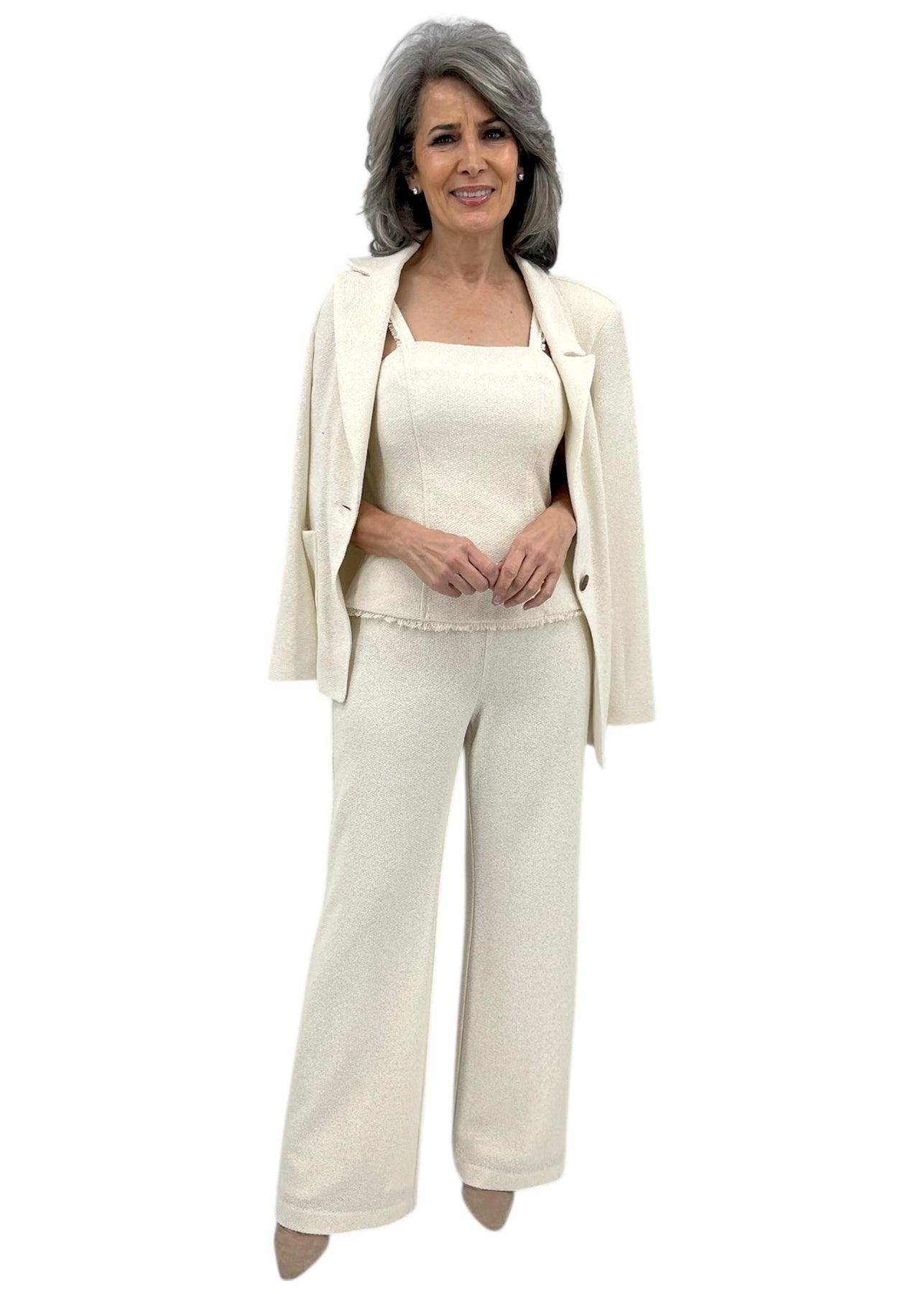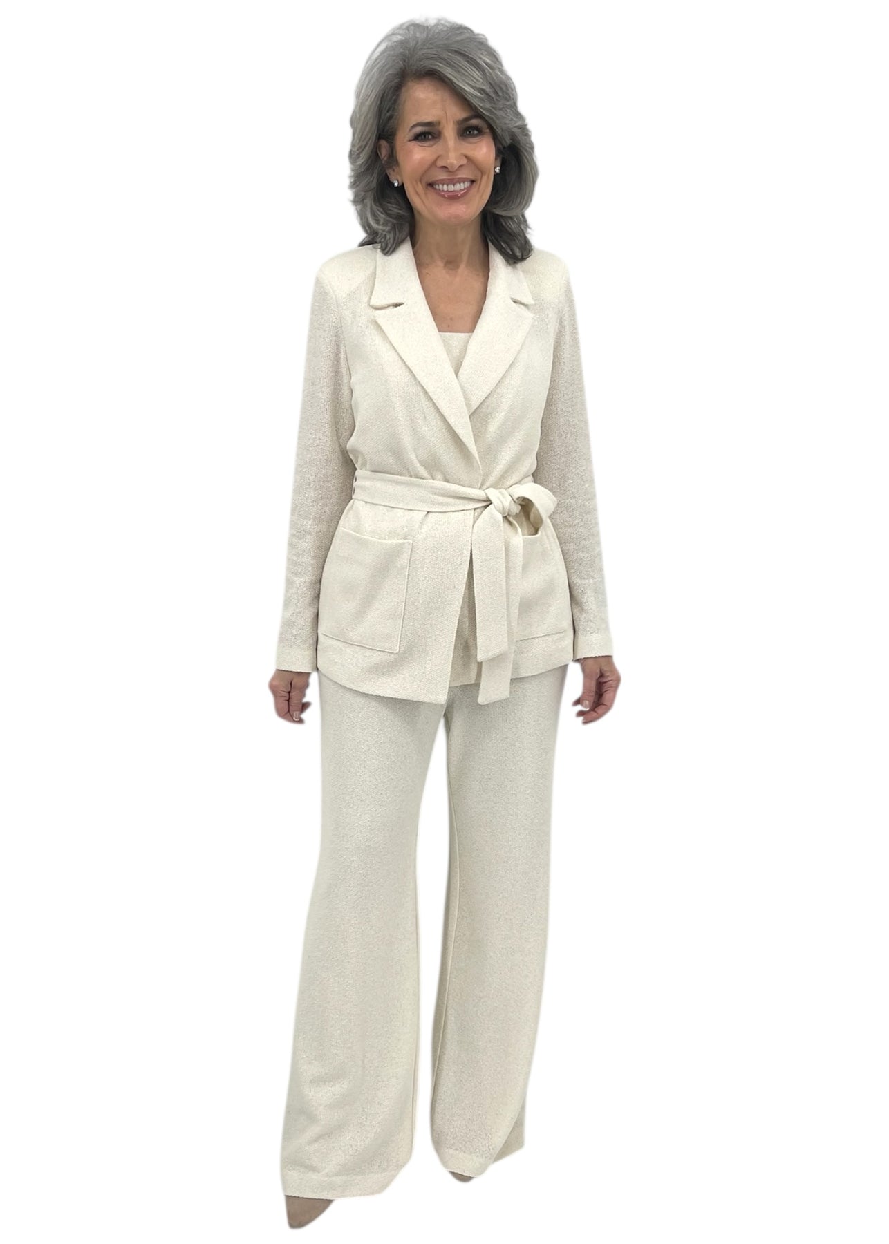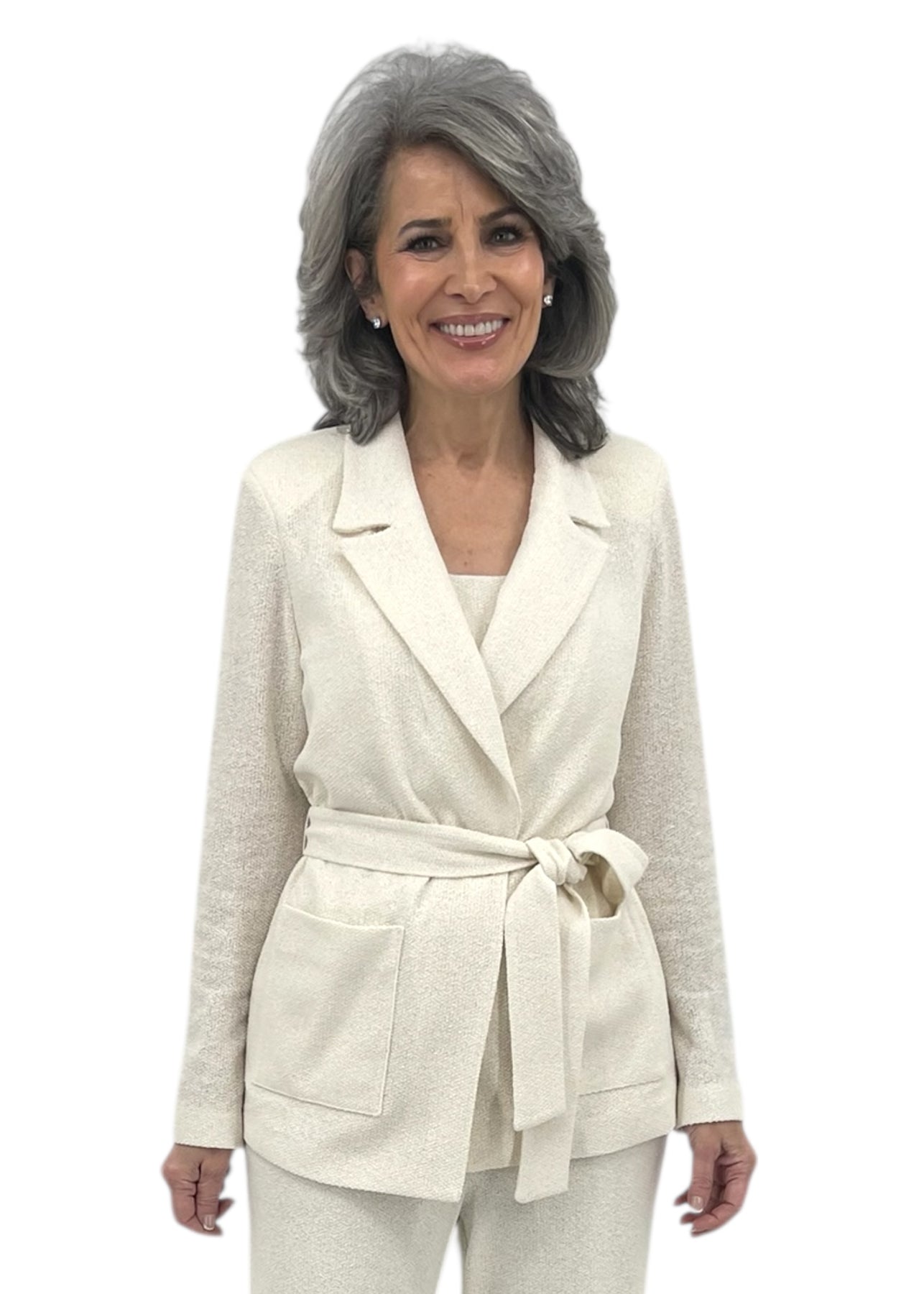 Elevate your wardrobe with this refined belted blazer jacket in ivory. Tailored with a structured silhouette and cinched waist, it delivers polished sophistication for both professional and elevated casual occasions. The coordinating matching set ensures a cohesive, put-together look that transitions seamlessly from boardroom to evening events. Perfect for layering over dresses or pairing with tailored trousers for timeless elegance.