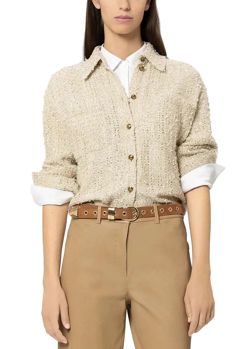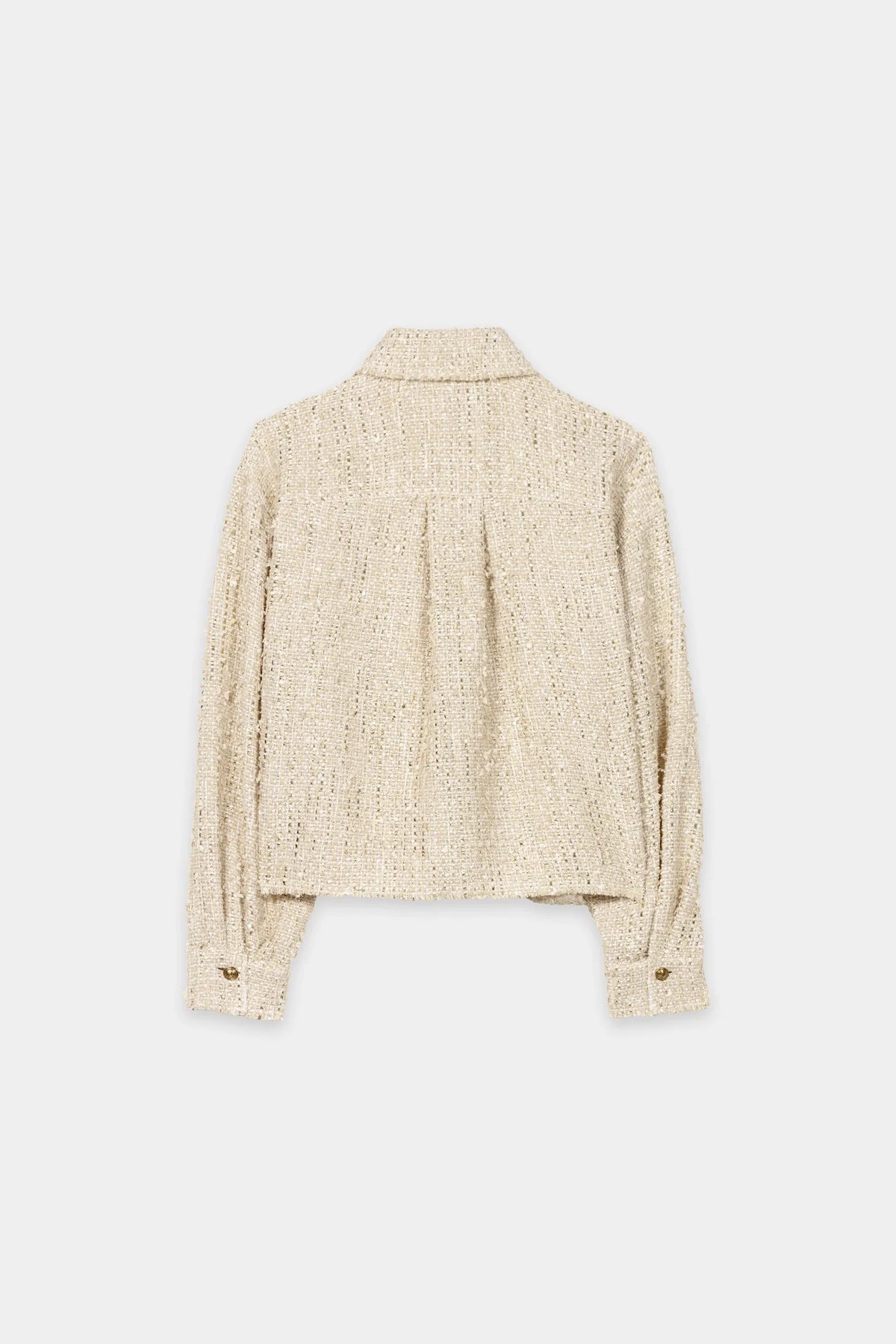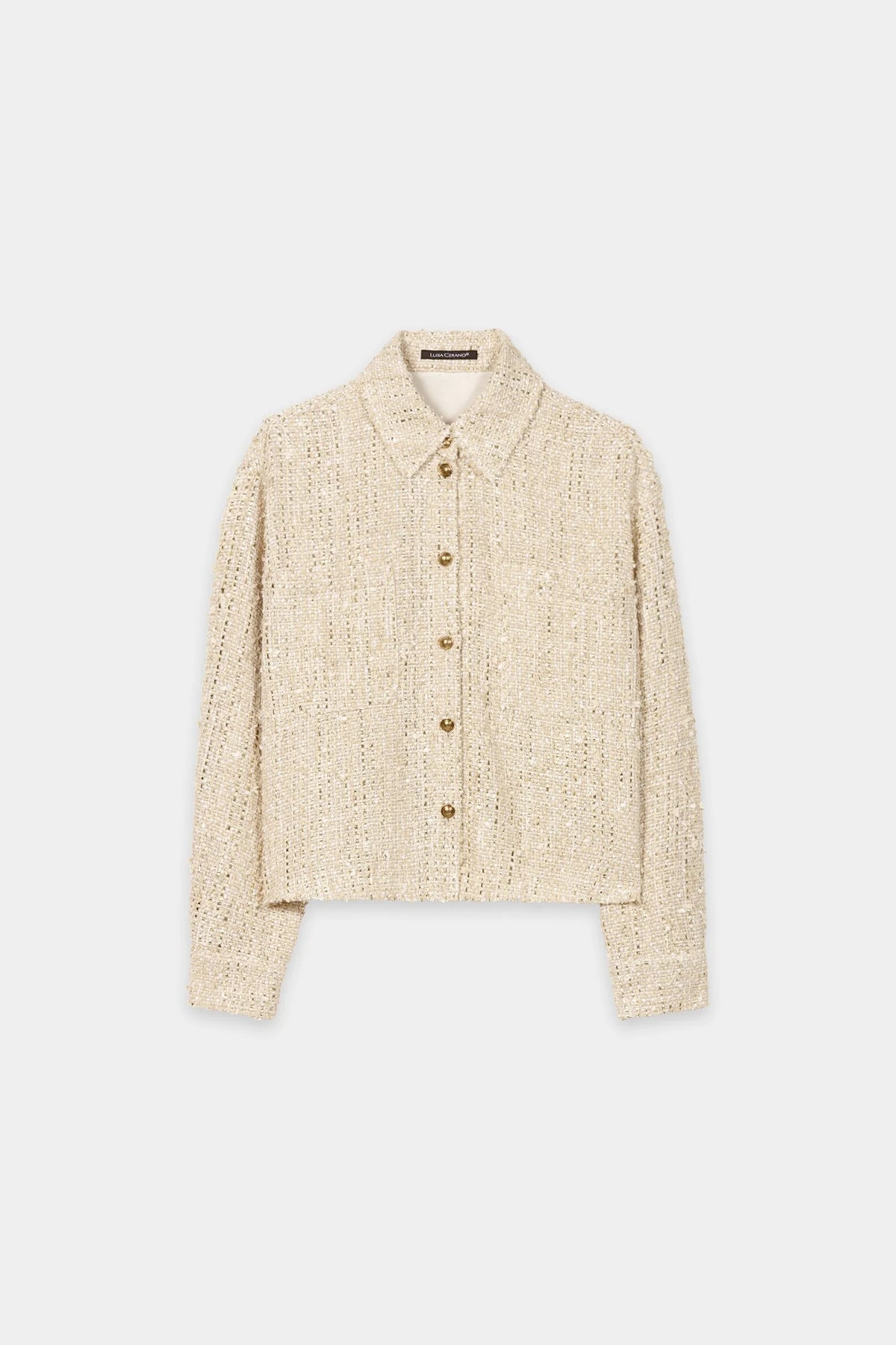 Short, unlined tweed jacket with a collar, button placket, two breast pockets and open hems. The incorporated shiny yarn creates a special effect.